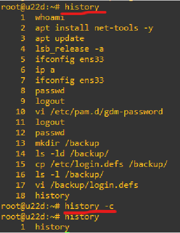 history -c -> 최근에 입력한 명령어들 지우는 명령어