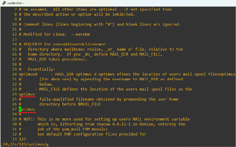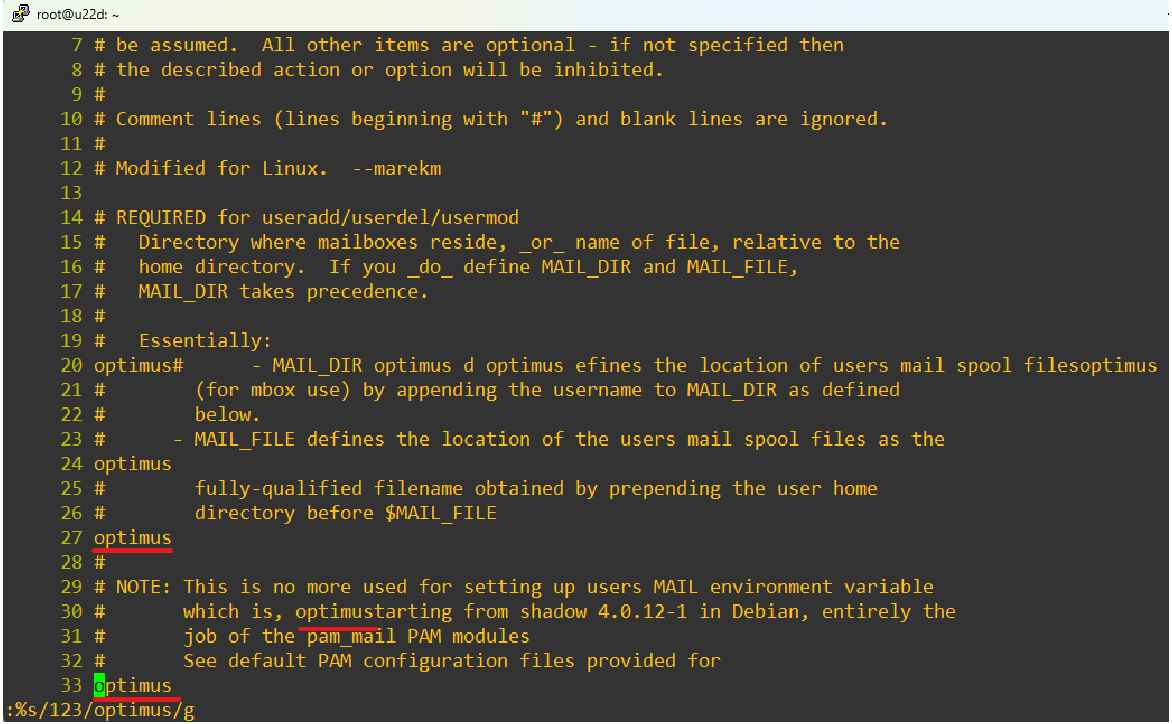 ● g 옵션을 주면 그 줄에 위치해 있는 123으로 되어있는 단어를 전부 optimus로 바꾼다.