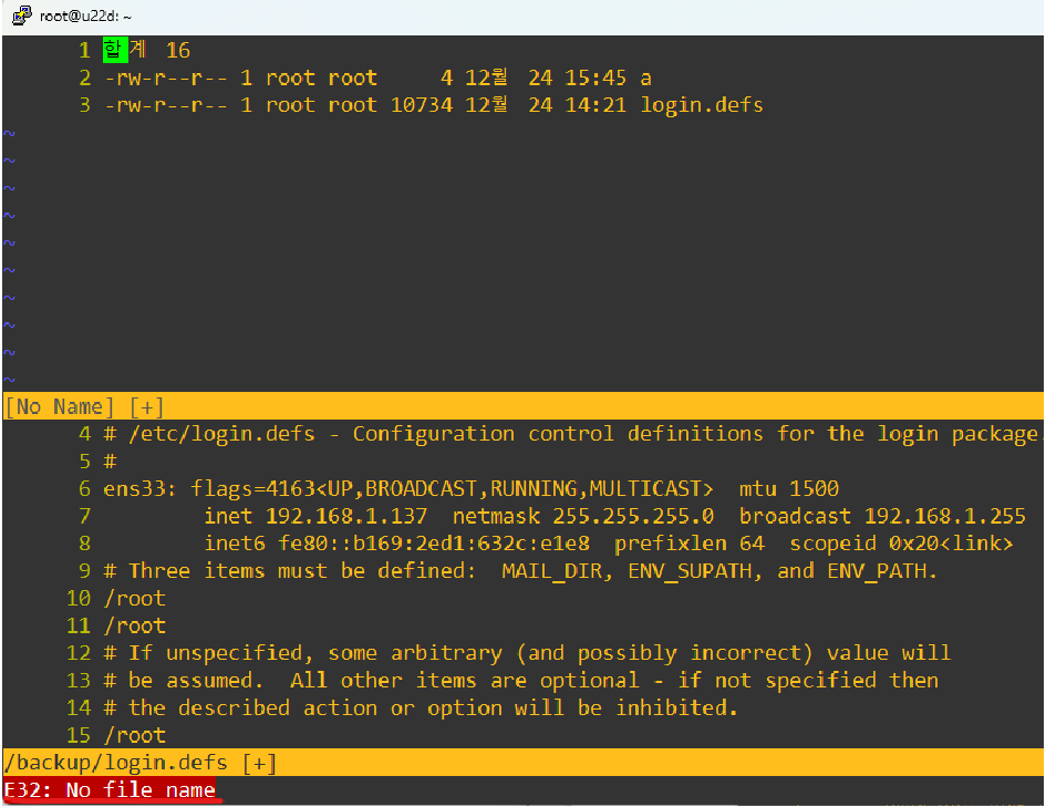● 새 창에 내용을 넣고 그냥 w로 저장하게 되면 파일 이름이 없다고 나온다.